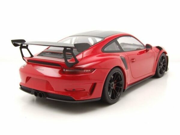 Die Lackierung in leuchtendem Rot in Kombination mit den schwarzen Akzenten verleiht dem Modell eine aggressive und dynamische Optik. Die aerodynamischen Elemente, wie der Heckflügel und der Frontsplitter, wurden präzise nachgebildet und unterstreichen den Rennsportcharakter des GT3 RS. Die Felgen, die Bremsanlage und die Reifen sind ebenfalls authentisch gestaltet und tragen zur hohen Detailtreue des Modells bei.